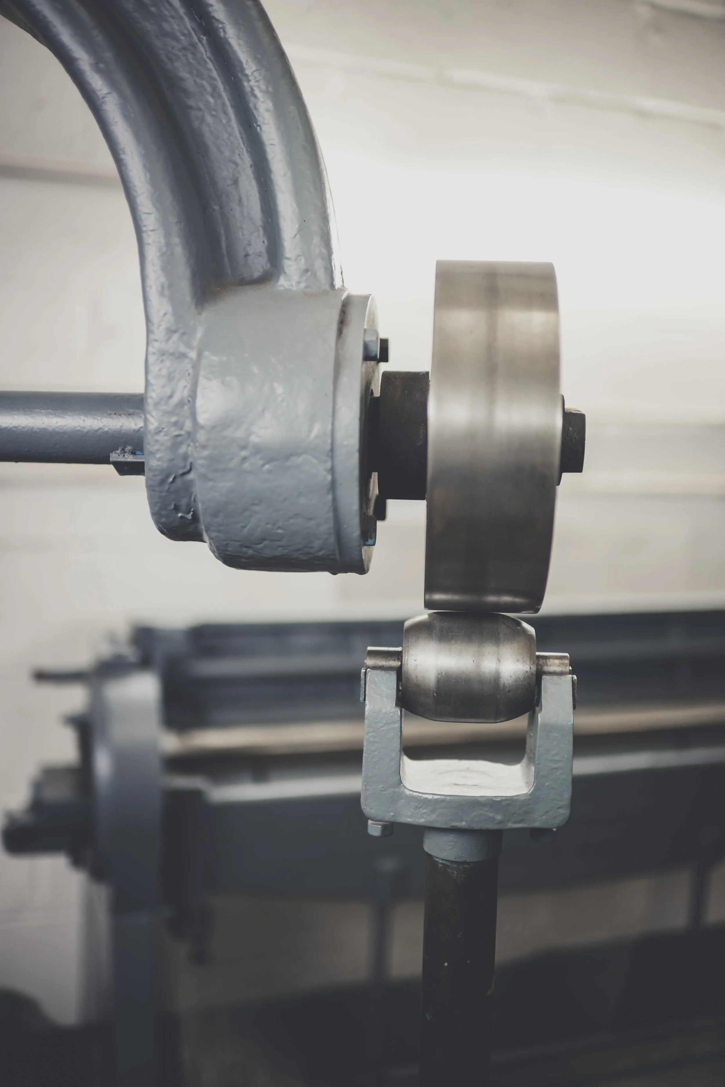 The machine is shaped like a large, closed letter "C". At the ends of the C, there are two wheels. The wheel on the top is called the rolling wheel, while the wheel on the bottom is called the anvil wheel. (Some references refer to the wheels by their position: upper wheel and lower wheel.)
